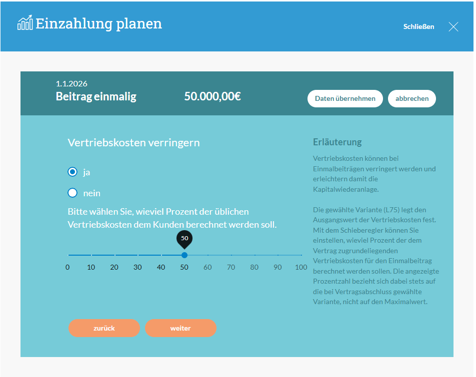 Du kannst direkt bei Antragstellung (in IPOS) festlegen, ob und wie stark die beitragsbezogenen Abschluss- und Vertriebskosten für einen Einmalbeitrag reduziert werden sollen.