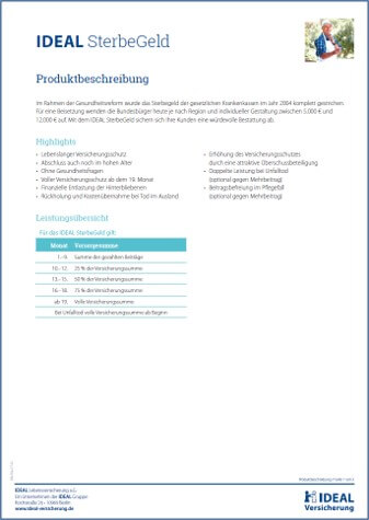 Geben Sie Ihren Kunden die Chance auf einen angemessenen Abschied. Mit dem IDEAL SterbeGeld und der neuen Kampagne steigern Sie Ihr Geschäft und unterstützen Ihre Kunden den eigenen Abschied finanziell abzusichern - ohne böse Überraschungen für die Angehörigen.